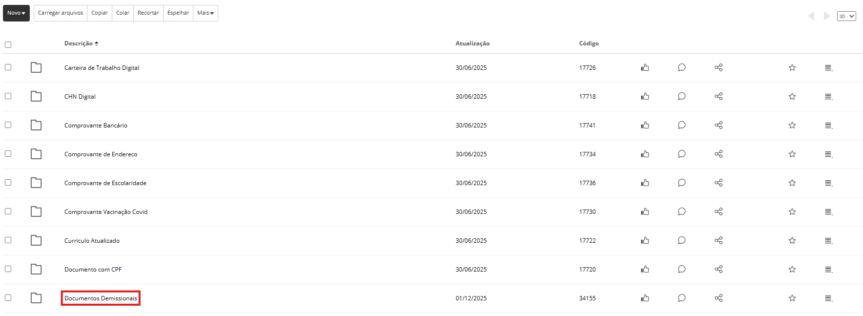 Dentro da pasta, estarão todos os documentos já enviados até aquele momento.