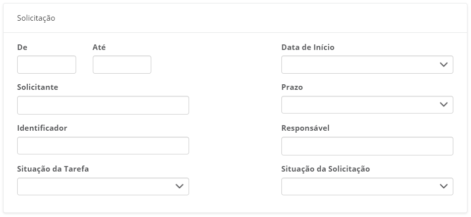 • De / Até: São campos referentes ao número da solicitação. Caso forem preenchidos, o filtro exibirá como resultado as solicitações de processo que estão entre o intervalo informado. Exemplo: informando 1000 a 2000 exibirá como resultado as solicitações de processo com número dentro intervalo especificado, o que pode resultar em uma solicitação de processo ‘X’ de número 1359.