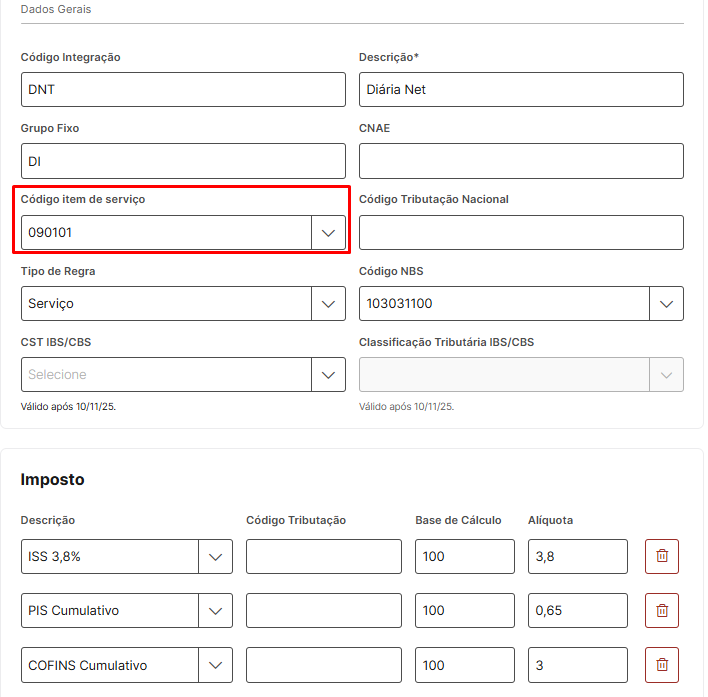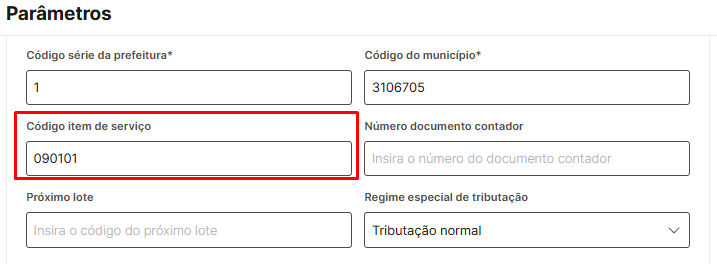 (informação) O código de tributação precisa estar vazio e o código item de serviço precisa estar como 090101, conforme exemplos acima.