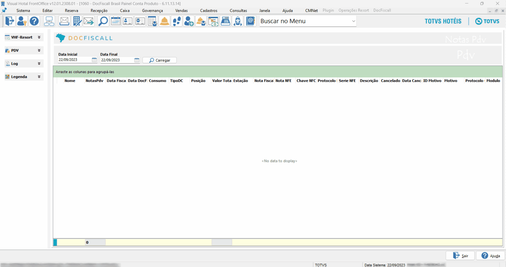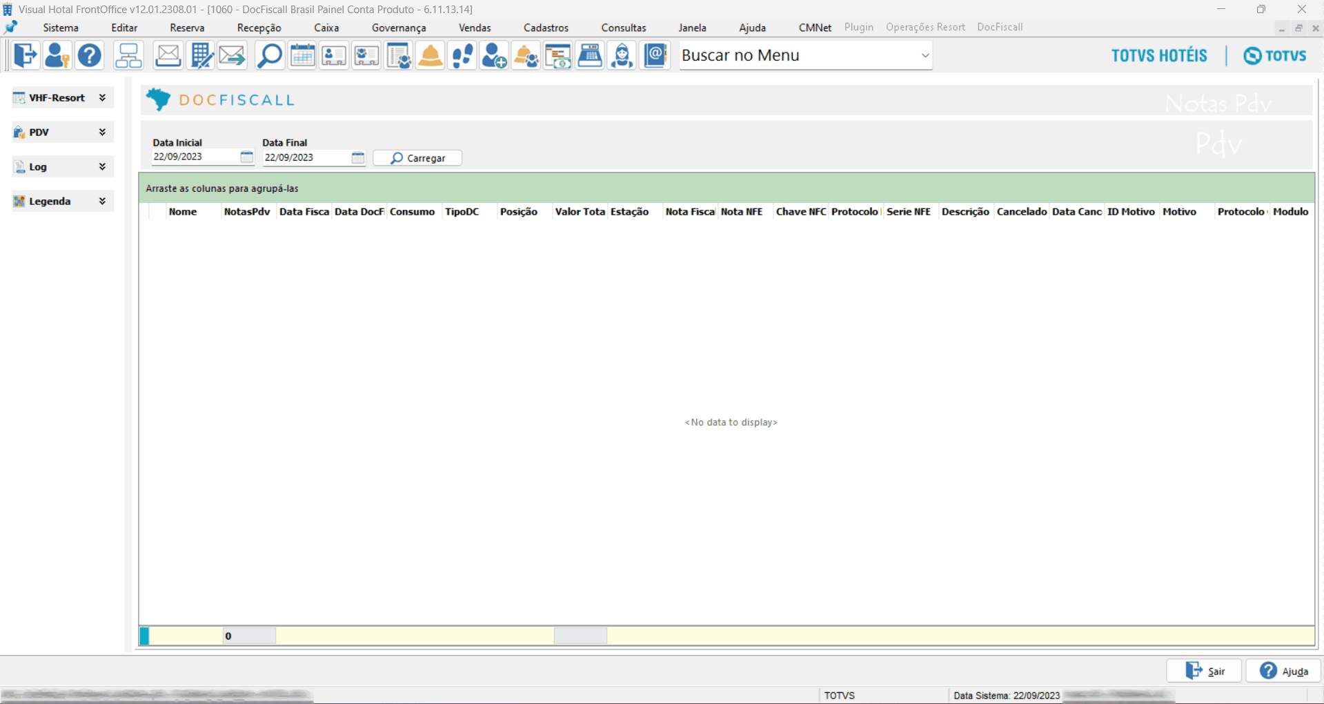 Estando em Ambiente Resort, acesse o painel conta produto. Informa a Data Inicial e a Data Final e clique no botão Carregar.