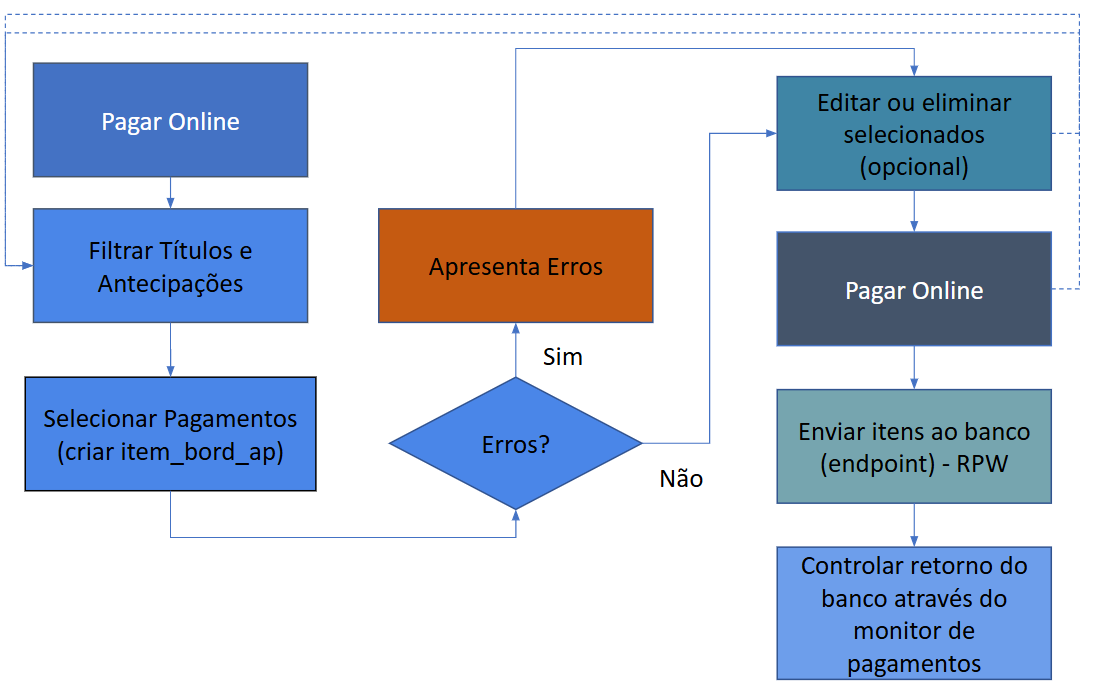 A opção Pagar Online da Central de Pagamentos permite ao usuário realizar o pagamento de títulos de forma prática e rápida, utilizando a tecnologia de pagamento instantâneo via PIX. Atualmente, os pagamentos são processados por meio dos bancos: Santander, Banco do Brasil (a partir da versão 12.1.2603)  e Itaú (a partir da versão 12.1.2603), utilizando a API de comunicação bancária: APB553ZA - API Pagamento Online .