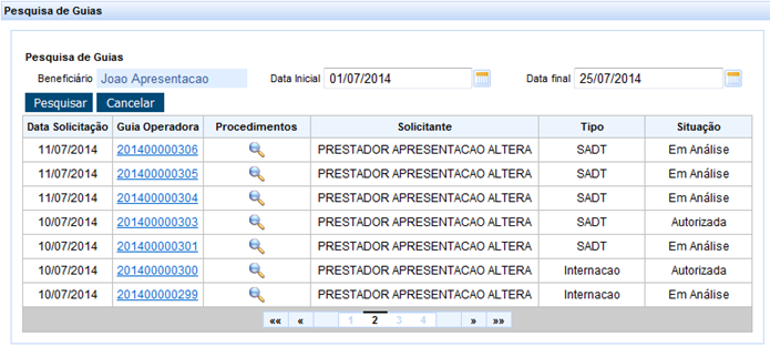 Ao posicionar o mouse em cima da coluna “Procedimentos”, serão exibidos os procedimentos da guia.