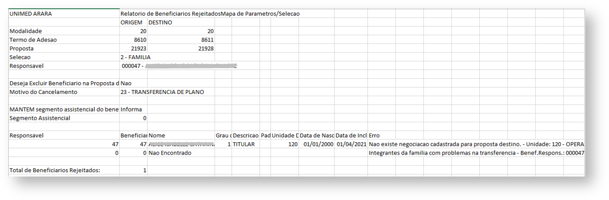 | Transferir | Permite ao usuário realizar a transferência de um beneficiário de um contrato a outro. Deve-se selecionar o contrato de destino e a cobertura opcional para realizar o procedimento. Pode ser efetuado a transferência individual ou por família. Caso ocorra algum problema na transferência, será gerado um relatório CSV com os erros apresentados. Exemplo: OBS.: Caso as configurações de repasse, estejam habilitadas, quando transferido será verificado se no contrato destino está parametrizado a unidade de atendimento, conforme programa Manutenção associativa propostas x unidades repassadas RB0110F. Caso estiver as informações serão replicadas para o contrato destino. Para habilitar a transferência de beneficiário no Portal Empresa é necessário que o parâmetro "Bloquear funcionalidade de transferência do Acesso Empresarial" esteja desmarcado no contratante da proposta. Esse processo pode ser configurado para cair ou não em auditoria conforme parâmetro "Auditar transferências realizadas pelo Portal Empresa", junto as configurações do Venda de Planos. Para transferências no qual o contrato destino do beneficiário satisfaça uma regra cadastrada no programa Manutenção das Regras de Inclusão e Exclusão de Beneficiários e que nesta regra:
