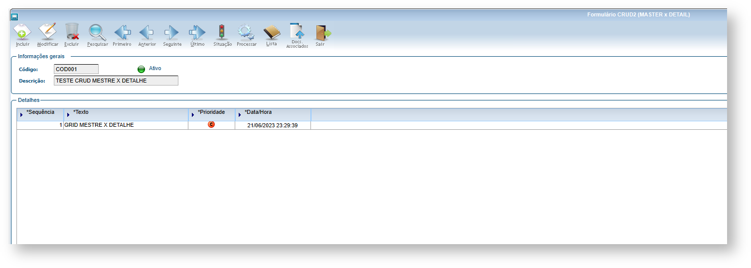 O arquivo CRUD2.ZIP anexo contém o arquivo XML do (formulário + tabelas) para importar via sincronizador metadado e o código fonte 4GL de exemplo do programa metadado CRUD2 (Formulário CRUD Mestre X Detalhe) apresentado no segundo exemplo acima.