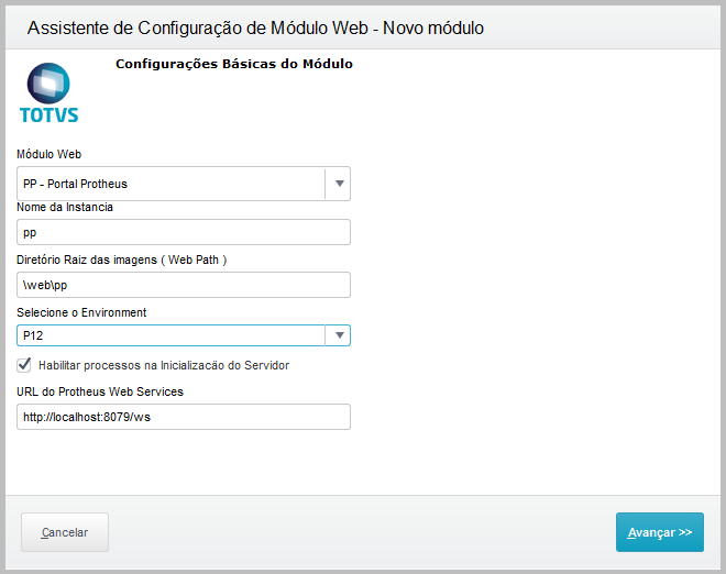 - In Web Module, select WS - Microsiga Protheus Web Services - In Name of Instance enter ws - The Root Directory of the images is automatically filled out - In Select Environment, click then select Protheus environment that is used - Select box Enable processes in the Initialization of the Server, then click Next
