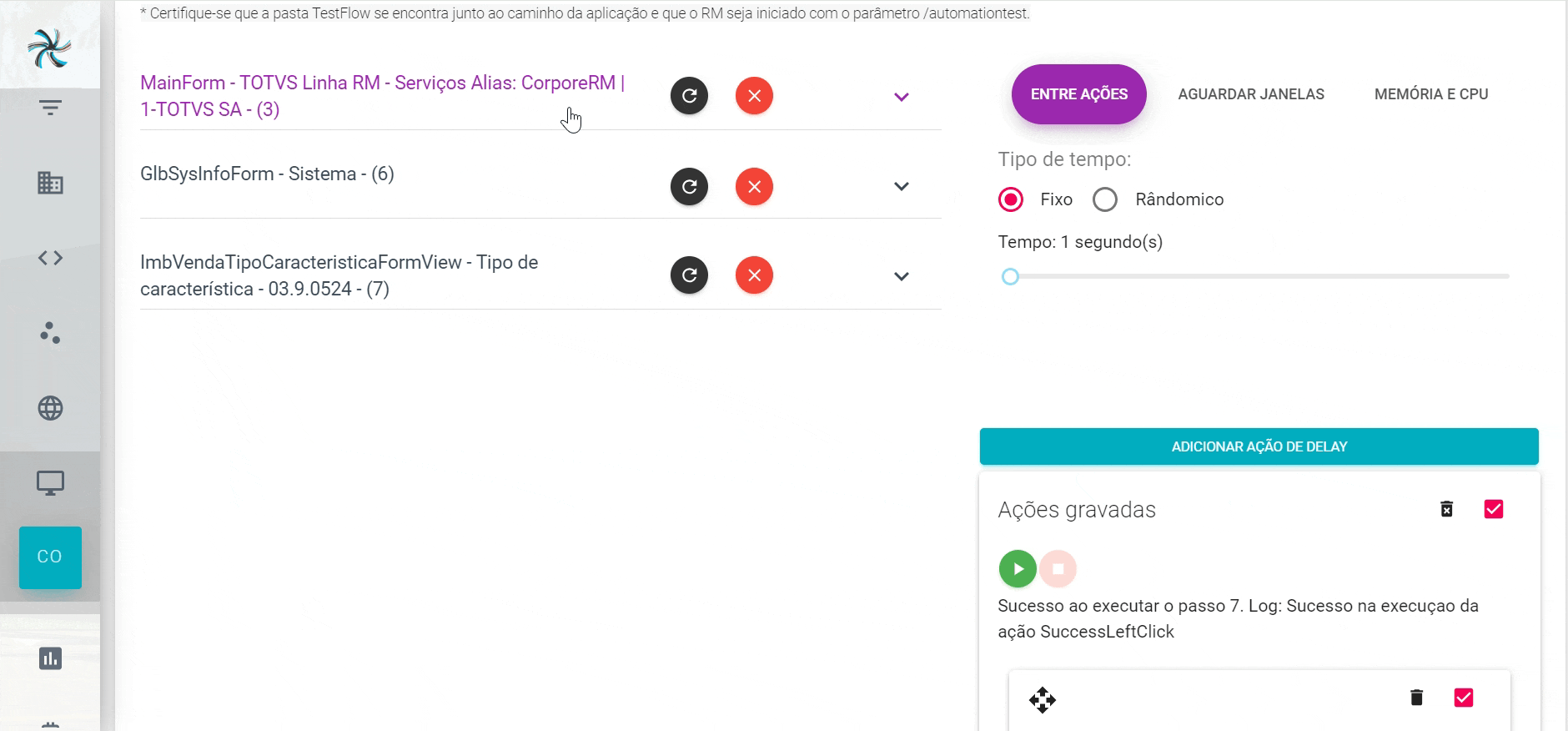 R: Verifique se o Agent está online e funcionando corretamente, e assegure-se de que o ambiente RM foi aberto utilizando o atalha com a tag "/automationtest" e também está ativo e operando normalmente. Além disso, verifique se a pasta TestFlow está no diretório TOTVS/CorporeRM/RM.Net.