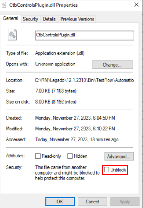 É importante garantir o desbloqueio dos arquivos do Agent e os plugins do WinForms, usando a opção Unblock do Windows.
