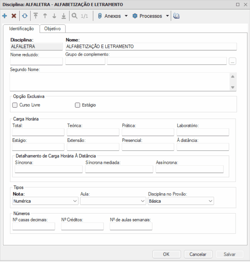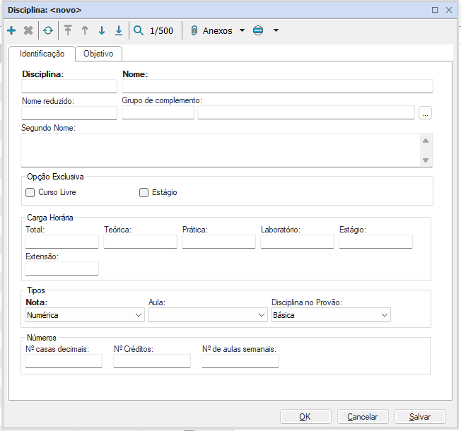 O campo Grupo de Complemento é aplicável apenas ao ensino superior e possibilita associar conteúdos complementares à disciplina, como: