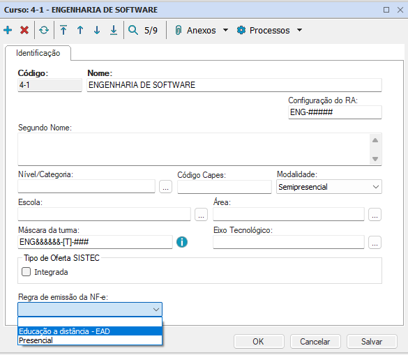 A partir da versão 12.1.2510, o campo Modalidade passa a se chamar Nível/Categoria. Já o campo Presencial/Distância foi renomeado para Modalidade.