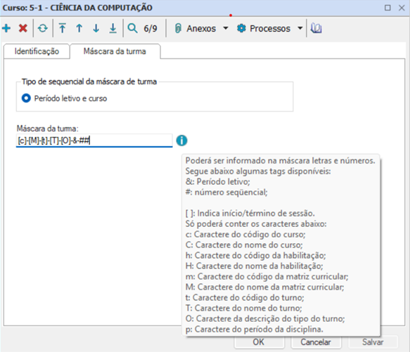 Letras e números | Poderá ser usado qualquer letra e/ou número na montagem da máscara, exemplo: Imagine que as turmas serão montadas com o nome "TURMA"+ sequencial então: a máscara será TURMA ### simplesmente. |