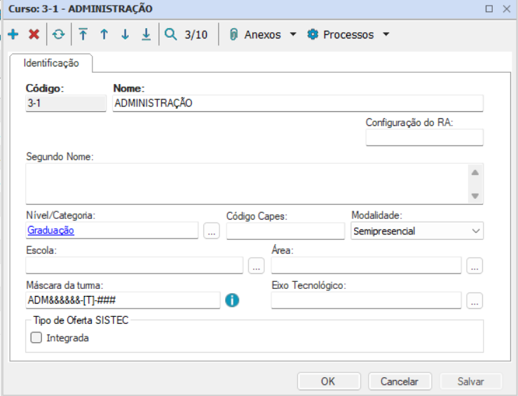 A partir da versão 12.1.2510.127, houve uma alteração na máscara do curso: o número sequencial passou a ser iniciado pela combinação Período Letivo/Curso.