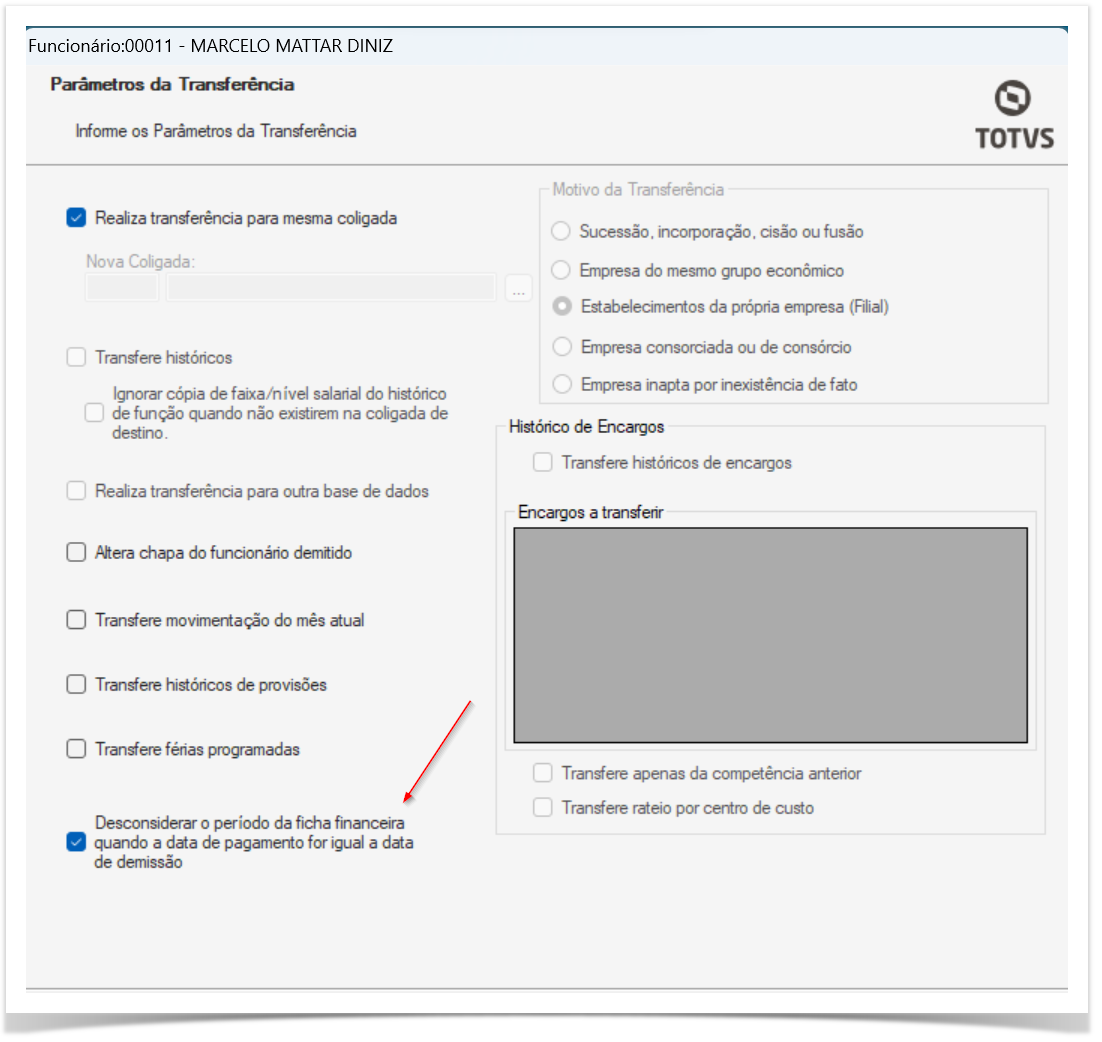 Na tela de transferência selecionamos mesma coligada e marcamos o parâmetro "Desconsiderar o período da ficha financeira quando a data de pagamento for igual a data de demissão":