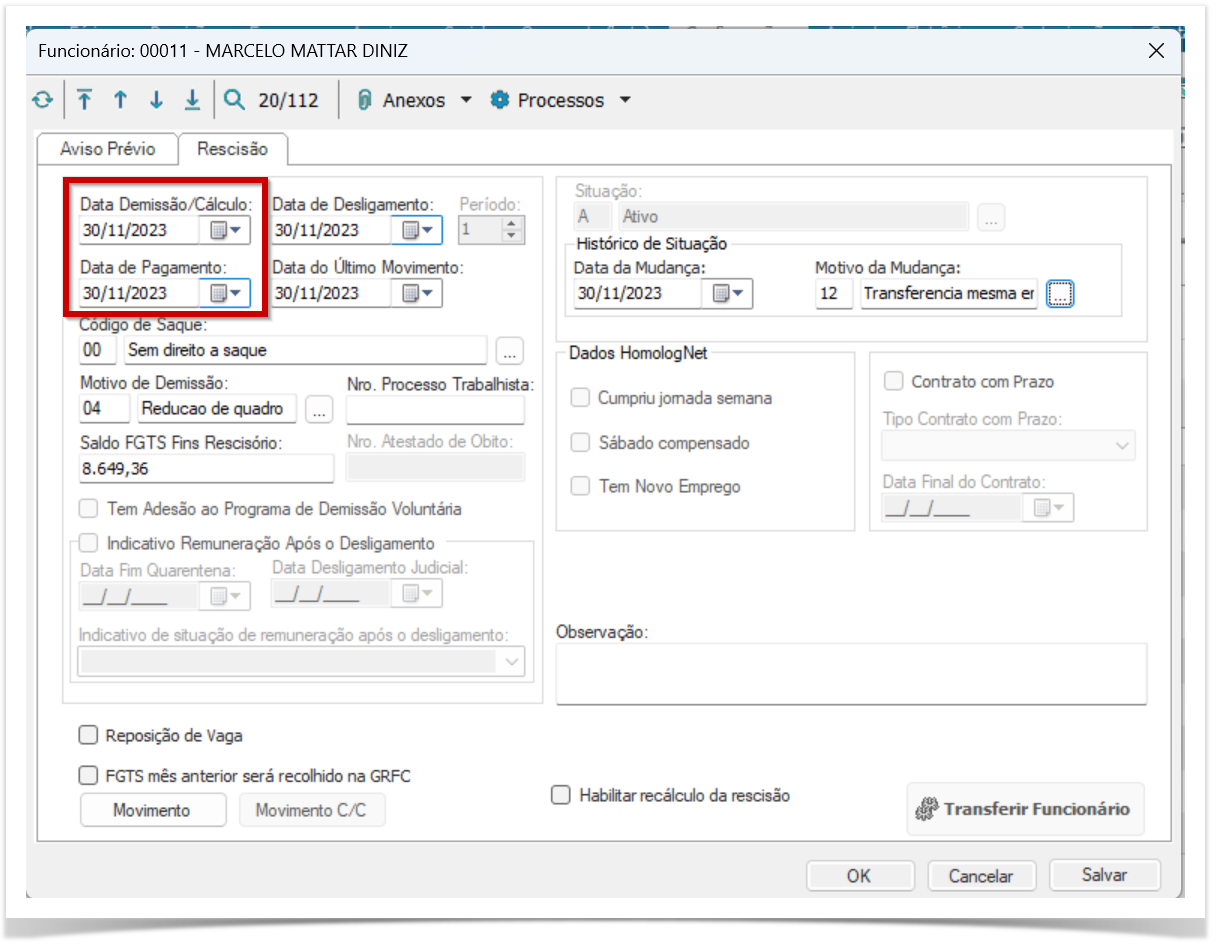 Transferência -Desconsiderar período Ficha financeira (DIRF /Informe)