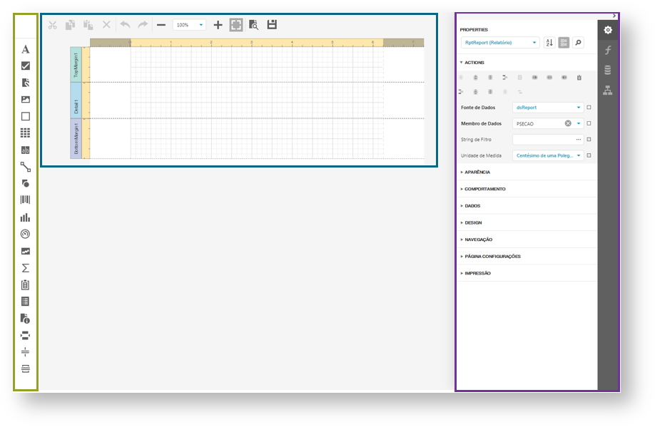 O objetivo desta página tem por finalidade demonstrar as ferramentas e funcionalidades da etapa Design do TReports.