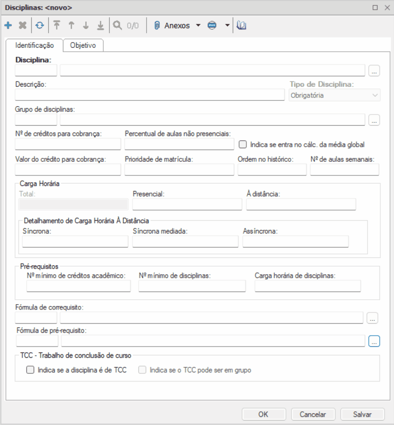 Esta janela permite cadastrar as disciplinas da matriz curricular, informando as informações de número de créditos, número mínimo de disciplinas entre outras informações que complementam estas disciplinas.