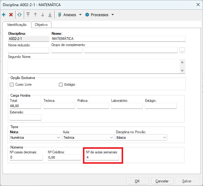 Ao cadastrar uma nova disciplina na matriz curricular, o campo Nº de aulas semanais da disciplina da grade será preenchido de forma automática com o valor definido previamente no cadastro da disciplina.