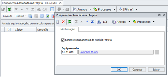 - Opção de Menu: Projetos \ Construção e Projetos \ Controle \ Mobilidade \ Equipamentos \ Equipamentos Associados ao Projeto;