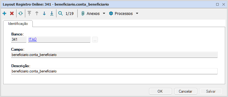Para que os dados do registro online sejam enviados para o banco deve ser cadastrado os campos do layout através da opção "Layout Registro Online" (localizado no cadastro do Banco, disponível no menu Movimentações Bancárias | Bancos e Agências) de acordo com o manual do Banco. Exemplo: Abaixo um exemplo de agrupamento e tags do campo do layout beneficiario.conta_beneficiario, onde: