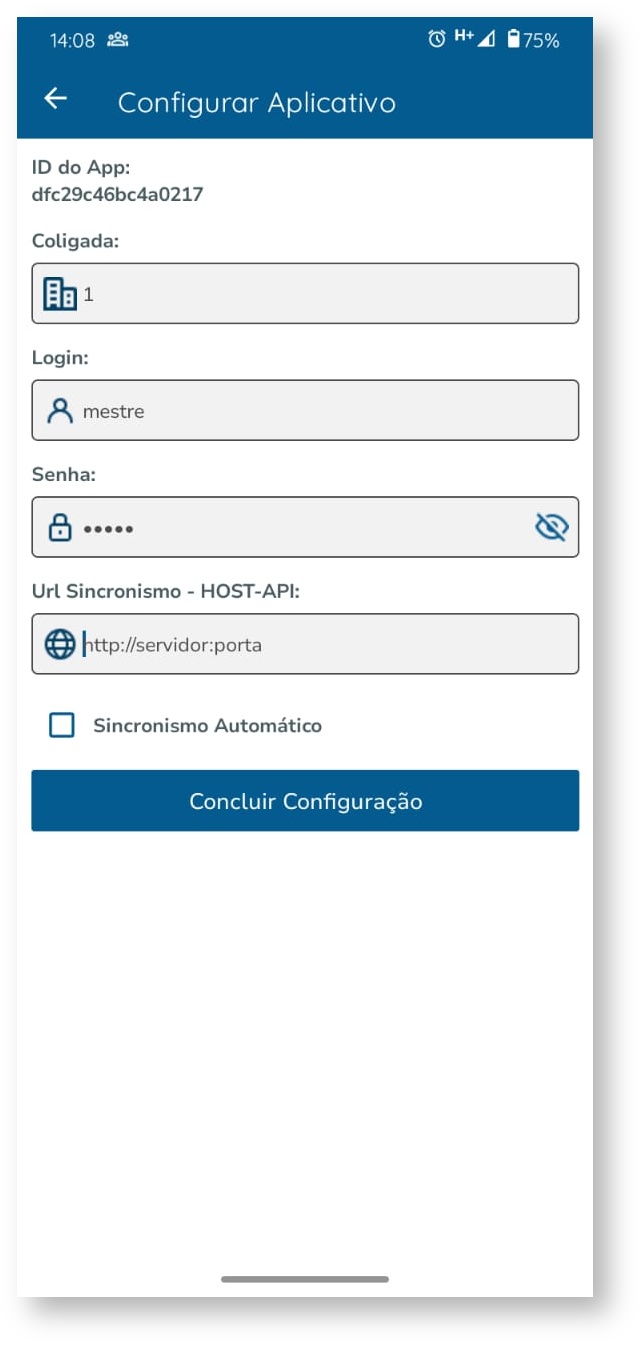 - Com a aplicação no coletor aberta, realizar o sincronismo com o usuário e senha de acesso a base de dados do TOP, ou seja, usuário definido para utilização do coletor;
