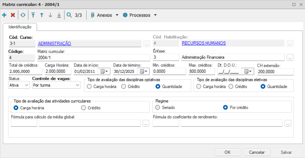 Esses campos permitem que a Instituição informe a quantidade créditos mínimos e máximos. Esta quantidade será validada no processo de matrícula do aluno, sendo que o sistema irá verificar se a quantidade mínima de créditos foi atendida pelas disciplinas a serem matriculadas e se a quantidade máxima não foi extrapolada. A quantidade mínima somente irá ser validada se ela é menor do que a soma dos créditos das disciplinas restantes a serem cursadas.