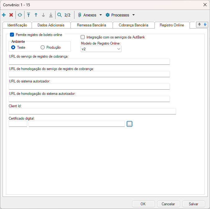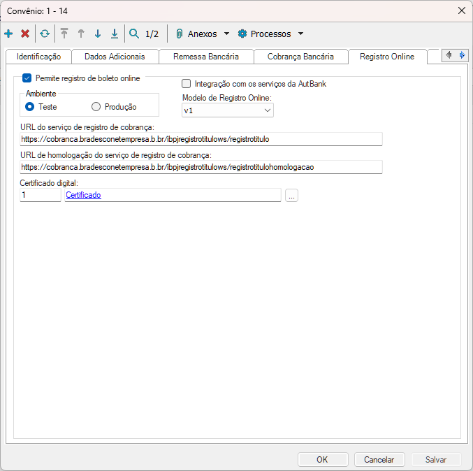- URL do homologação do serviço de registro de cobrança: Deve ser informado a URL de homologação do serviço de registro do boleto fornecida pelo banco.