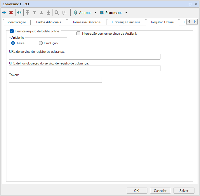 - Integração com os serviços da AutBank: Define que o banco utiliza o padrão da AutBank para o registro online de boletos.