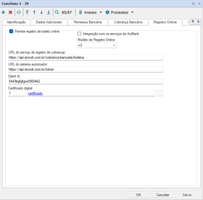 Através do cadastro do Convênio, localizado no menu 'Movimentações Bancárias', é necessário habilitar a opção "Permite registro de boleto online" e definir os parâmetros de acordo com os dados fornecidos pelo banco Sicoob. O TOTVS Gestão Financeira disponibiliza três modelos de registro: