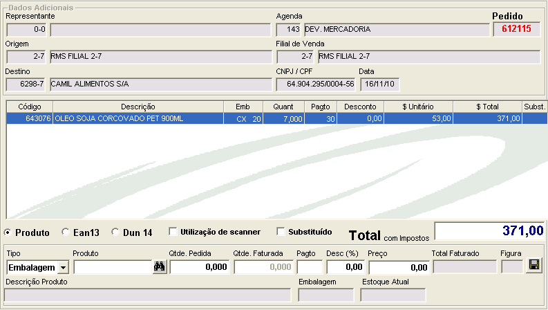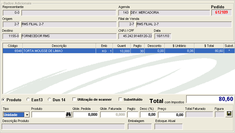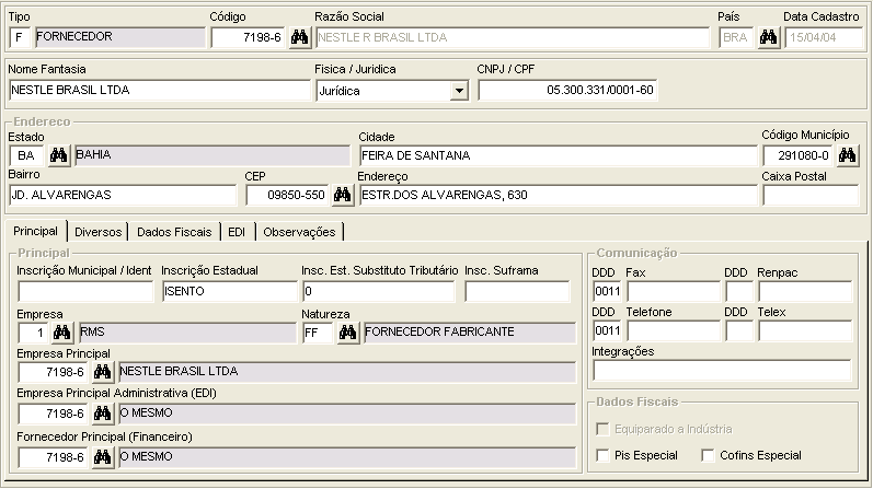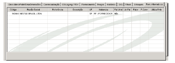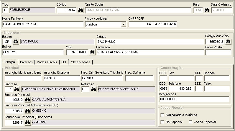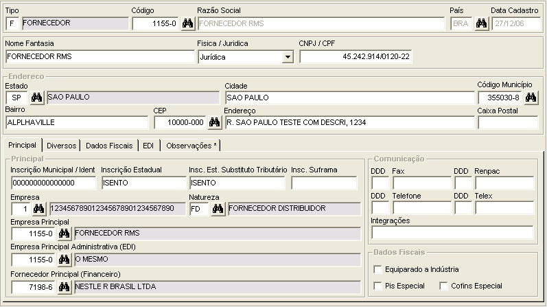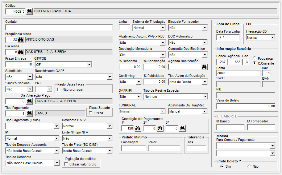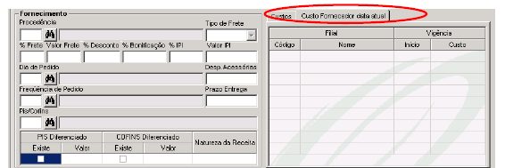 Fornecedor | Código do Fornecedor, deve ser cadastrado apenas para operações de Devolução de mercadorias específicas com para um determinado Fornecedor. |