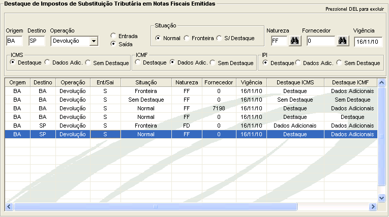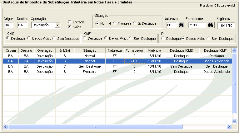 - Exemplo 1: Devolução para os Fornecedores Fabricantes localizados na Bahia (BA) com Situação Normal e com opção de Destaque para o ICMS, ICMF e IPI.