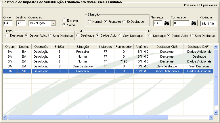 - Exemplo 2: Devolução para Fornecedor Fabricante localizado na Bahia (BA) com Situação Fronteira e com opção Destaque para ICMS e Dados Adicionais para ICMF e IPI.