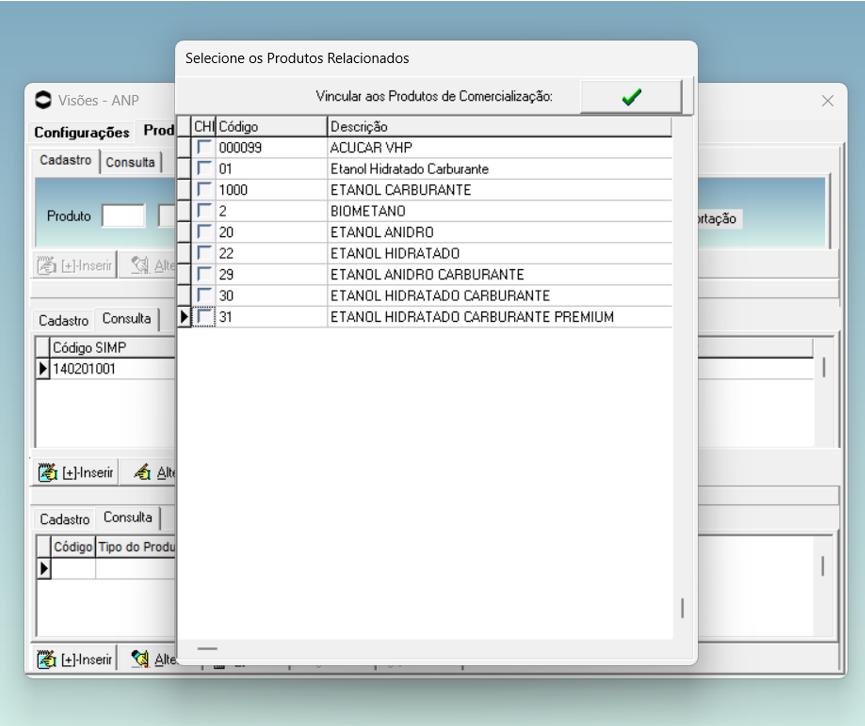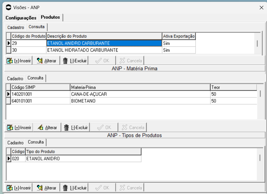 | Produto | Criar o produto ANP: Etanol Anidro Carburante, Etanol Hidratado Carburante, Biometano e/ou outros |