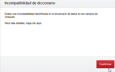 En caso de presentar el siguiente mensaje de incompatibilidad de los campos de cheques: