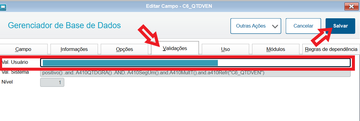10. Clique em na aba Validações, delete a chamada da função positivo() da seção Val. Usuário e clique em Salvar.