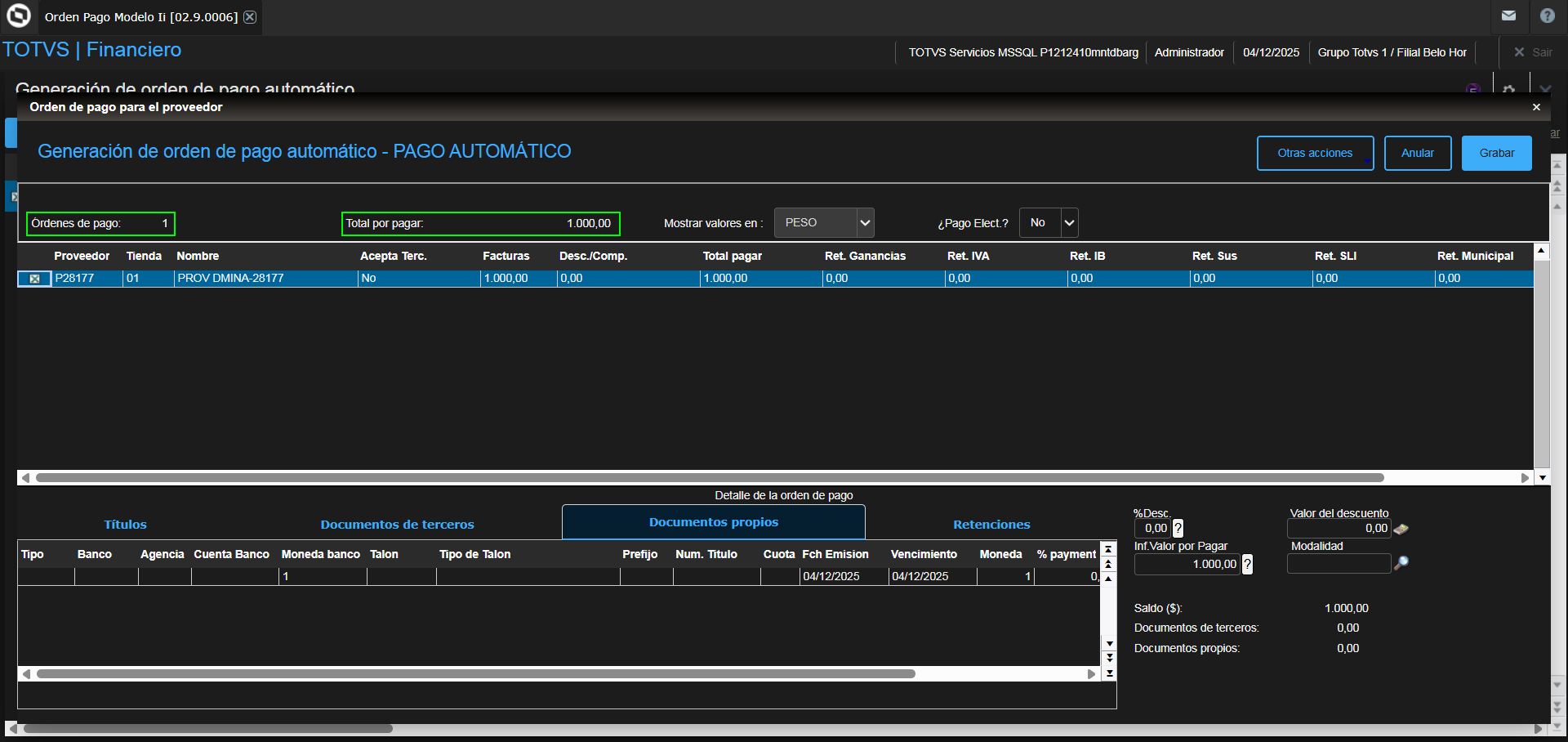 - Marcar el check box de la Factura de Entrada (NF) creada en las precondiciones y dar clic en "+Pago automático".