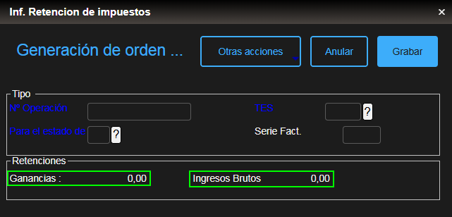 - En la función Impuestos de PA (F850ImpPA) se retira la instrucción COLOR CLR_BLUE para los valores de las etiquetas "Ganancias:" e "Ingresos Brutos:", de esta manera los valores serán impresos en color blanco cuando el sistema se encuentre en modo oscuro y en color negro cuando el sistema se encuentre en el modo tradicional.