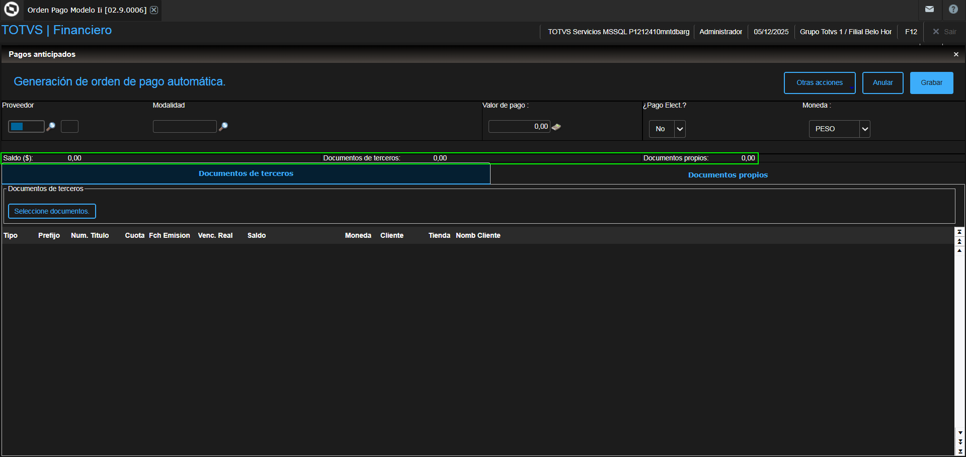 - En la función Pago Adelantado (F850PgAdi) se retira el fondo blanco para las etiquetas y valores "Saldo ($)", "Documentos de terceros" y "Documentos propios".