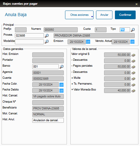 - Seleccionar el Pago Anticipado y hacer clic en la opción Otras acciones | Anula Baja.