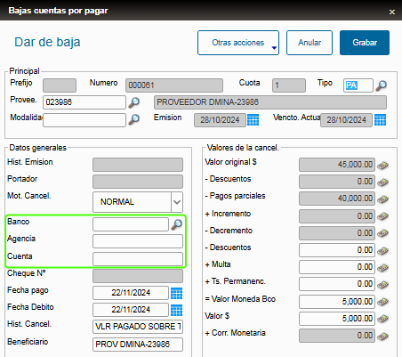 - En la ventana Bajas Cuentas por Pagar, mantener los datos propuestos y registrar el banco, Grabar el movimiento.