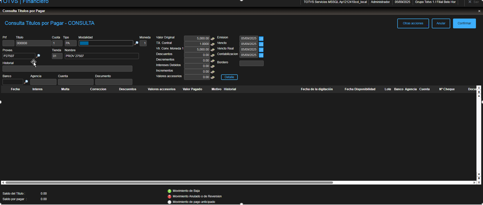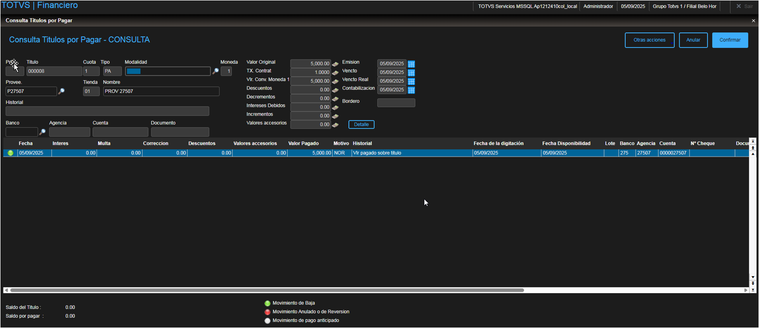 5. Verificar que el pago anticipado cambia de estado a "Título dado de baja"