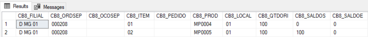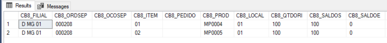 Neste exemplo, temos uma ordem de separação com dois itens, onde o segundo será inibido pelo ponto de entrada ao acessar a rotina como admnistrador.
