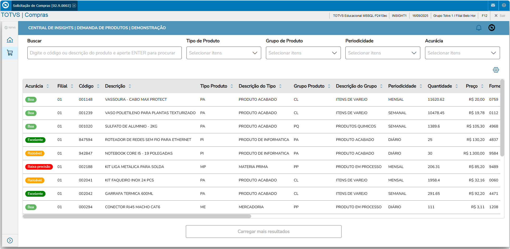 O Protheus Insights Compras - Demanda de Produtos está integrado à SOLICITAÇÃO DE COMPRAS (MATA110).