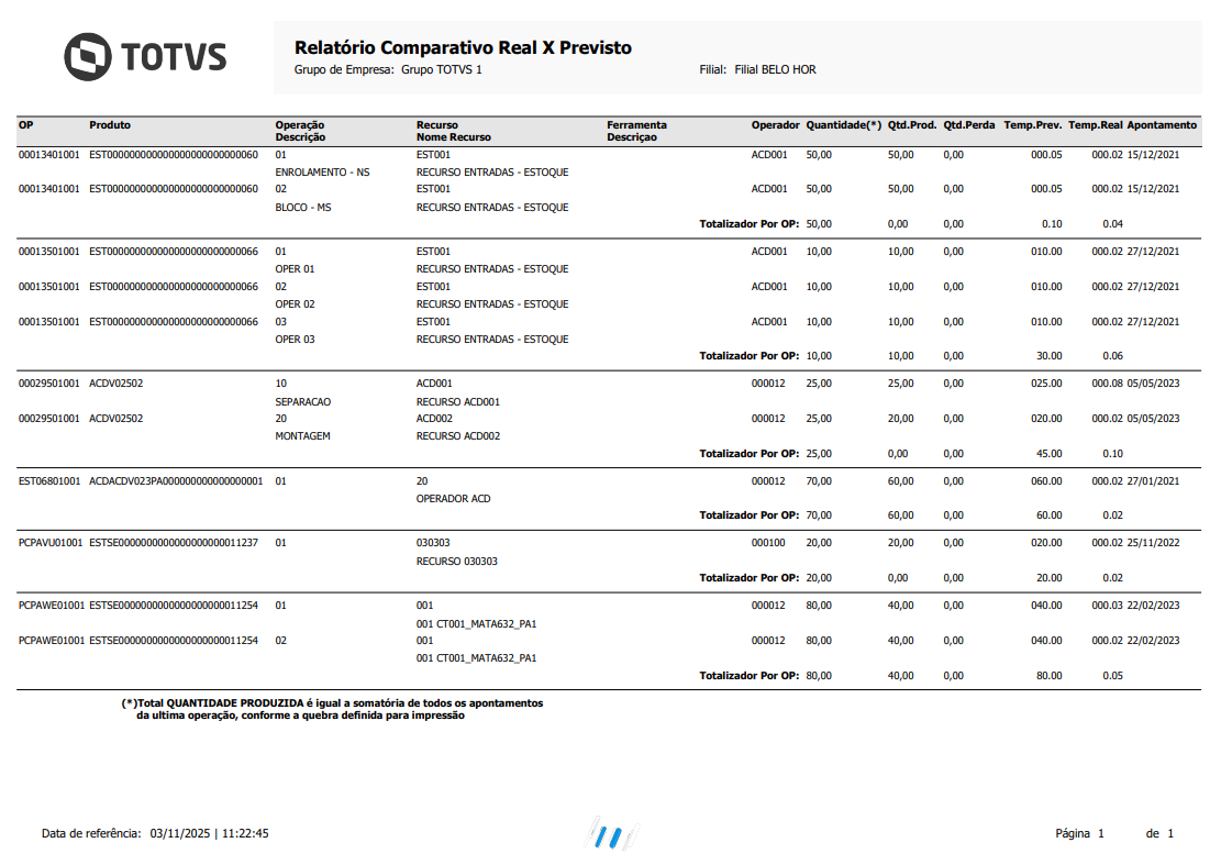 Através do objeto de negócio, está disponível o design "Comparativo Real X Previsto", responsável por emitir o comparativo entre o apontamento real da produção e o planejado, baseando-se no Roteiro de Operações.