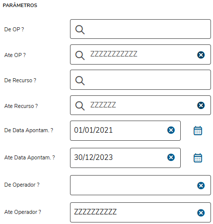 - De Data Apontamento ? - Indica o intervalo inicial da data de apontamento que será considerado na emissão do relatório.
