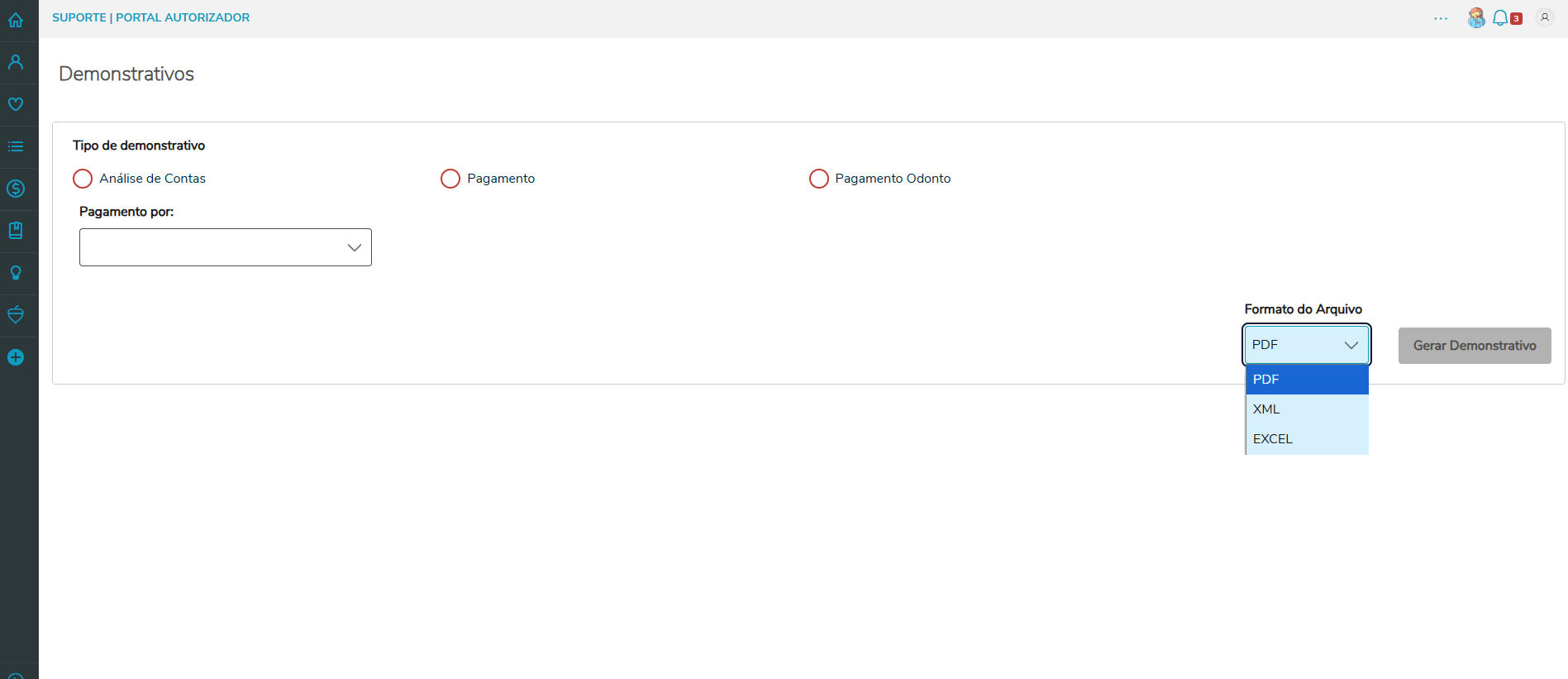Na rotina Faturamento > Demonstrativos, foi criado um novo campo para informar o formato do demonstrativo que deseja realizar o download; as opções são PDF, XML e EXCEL, porém o padrão é PDF visando manter a praticidade aos prestador.