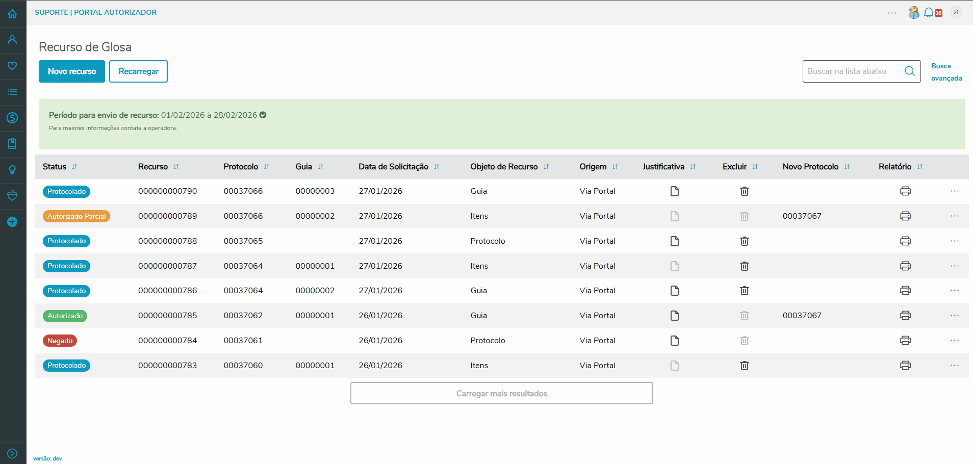 A tela de consulta de recursos irá exibir um histórico de todos os recursos feitos pelo prestador, indiferente da origem.