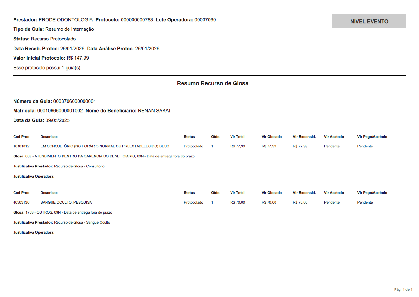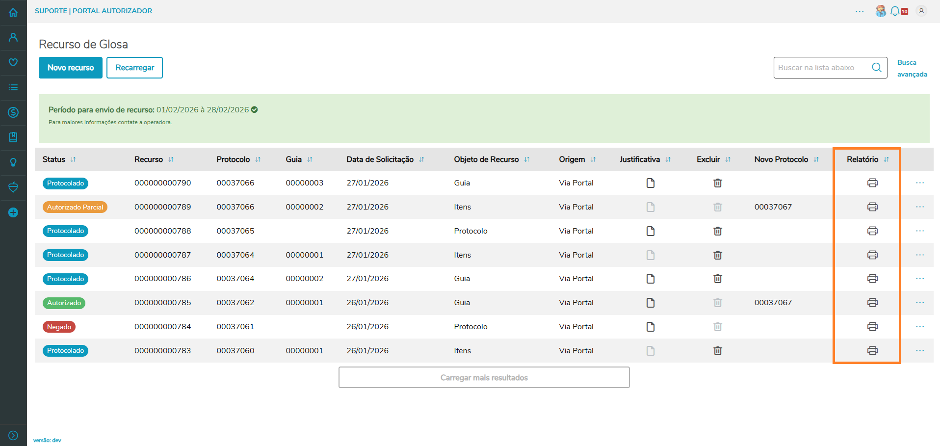 A partir de Fevereiro de 2026, foi implementada melhoria com a criação de um relatório com os dados de um Protocolo de Recurso de Glosa. O objetivo do mesmo é apresentar os eventos e seus respectivos valores e justificativas por parte do Prestador e Operadora. Para habilitar este relatório é necessário: