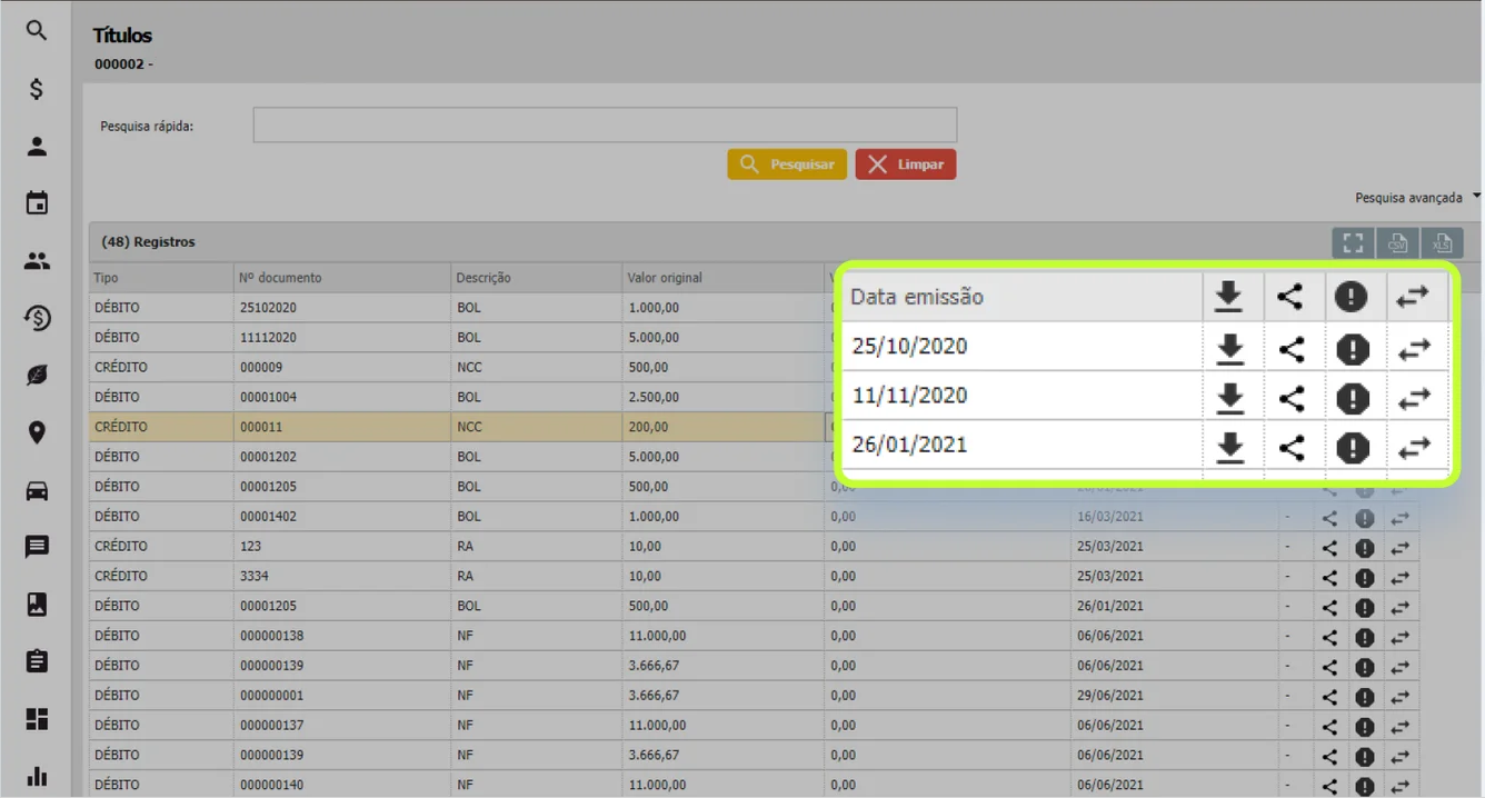 O botão para download estará visível na Listagem de Títulos quando o plugin estiver ativo.