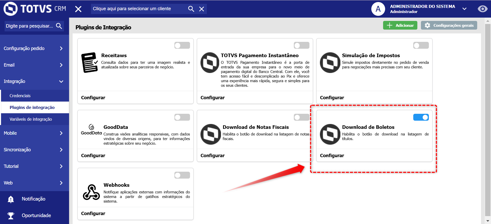 Na tela de Plugins de integração acessado em Configuração > Integração > Plugins de Integração, o sistema disponibiliza um card de nome "Download de Boletos" para ativar o recurso.