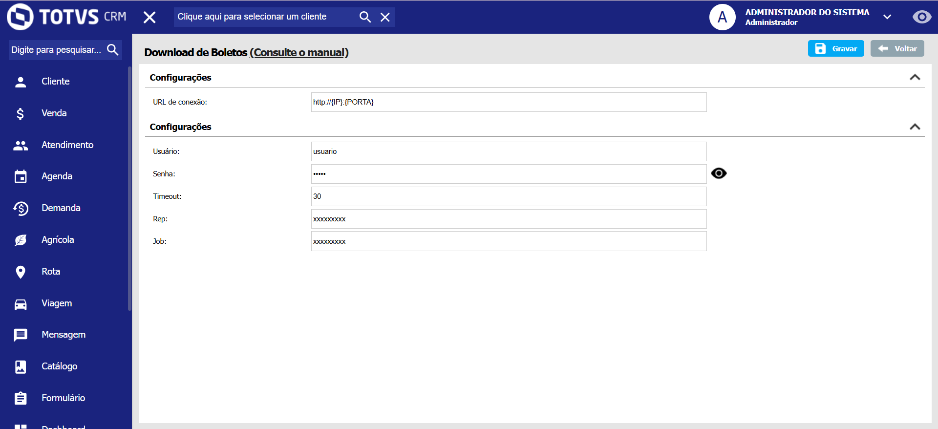| Job | Informe o nome do serviço Pentaho que faz a comunicação com a URL fornecida DOWNLOADBOLETO |