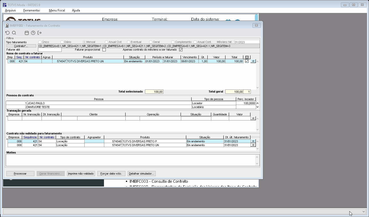 Gif 02 - Após cancelar o faturamento do item de contrato do mês 01, nota-se que foi possível faturar o período novamente.